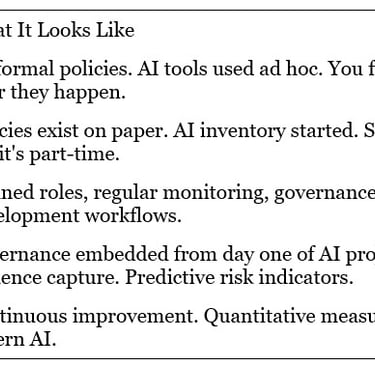 Automate where you can. Governance-as-code — automated compliance checks, evidence capture, monitoring dashboards — makes this sustainable. Manual governance doesn't scale.
